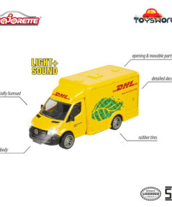 Ia juga hadir dengan berbagai fitur menyenangkan dan mudah digunakan, termasuk dua efek suara berbeda, dua lampu depan, dan pencahayaan untuk detail interior. Selain itu, model pengiriman DHL memiliki pintu belakang terbuka, ban karet realistis dengan pola tapak, dan jendela transparan.